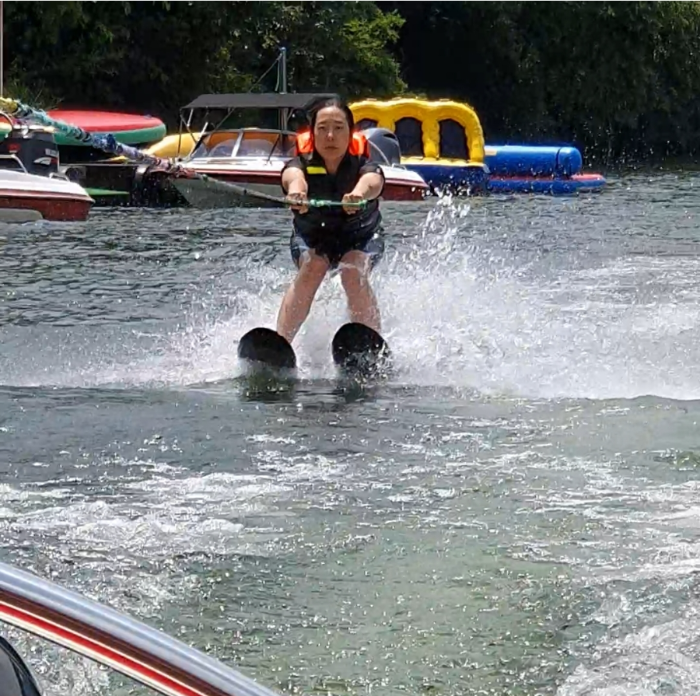 봉을 잡고 일어서는 것, 즉 스키가 물에 뜨는 과정을 무사히 마치면 길게 줄을 늘어뜨리고 본격적으로 수상스키를 탄다. 스키 손잡이를 두손으로 잡고 줄은 무릎과 무릎사이에 오게 놓고 발은 V자 상태로 사인을 기다린다. 배를 끌어주시는 코치님께 내가 준비되어 있음을 알리고 이내 배가 출발 하면서 줄을 당기기 시작한다. 바로 발을 11자로 만들어 주면서 자연스럽게 딸려가게 앉은 자세를 유지한다. 이 때 주의 해야할 것은 너무 타고 싶은 마음이 앞선 나머지 급하게 일어나려고 애쓰지 말아야 한다는 것이다. 어느 정도 속도가 붙고 스키가 물위로 뜨게 되면 엉덩이를 조금씩 올린다. 처음 시도하는 초보자들은 이 시점에서 바로 넘어지면서 물에 빠지게 된다. 나도 두 번 넘어지고 세 번만에 일어섰다. 세 번 시도에 일어선것은 그리 못한 것은 아니라는 말에 용기를 얻고 더 즐기게 되었다. 여튼 엉덩이를 어느정도 들었으면 이젠 무릎을 살짝씩 펴가면서 속도를 몸으로 즐겨보자. 빠지 마다 가르치는 것이 다르긴 하겠지만 나의 경우 자꾸 무릎이 붙다보니 스키가 양 옆으로 벌어지면서 내 힘으로 감당 못하게 되어 빠지는 경우가 많았다. 그래서 스키와 스키를 끈으로 묶어주셨다. 끈의 길이때문에 더이상 벌어지지 않으니 마음놓고 무릎을 붙지 않게 벌려도 물에 빠지지 않고 간격을 유지할 수 있었다. 그렇다고 너무 이 끈에 의지하게 되면 나중에 끈을 풀었을때 또 다시 적응을 해야하니 지금의 이 끈의 도움을 바탕으로 올바를 자세를 몸에 익히도록 해보세요.