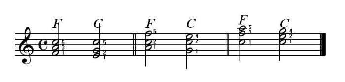 위 두 종지의 패턴 연습을 많이 하셨죠? 손 모양이 어떠했는지 기억 나세요? 화음을 맞게 치는 것에만 머무르지 마시고 이젠 좀 더 편하게 부드럽게 연결 할 수 있도록 연습해봅시다. 그러기 위해서 무조건 많이 반복 연습하자고 말씀드리는 것은 아닙니다. 제가 말하고 싶은 것은 아무리 복잡하게 진행 하더라도 손모양은 거기서 거기라는 겁니다. 지난 시간에 자리바꿈화음을 쓰는 이유를 설명드리면서 경제적인 이해를 언급했던 것을 기억하시지요? 손모양이나 팔을 많이 움직이면서 치는 것이 아니라 손가락 몇개만 움직여도 화음을 칠 수 있도록 하기 위해 가까이에 있는 화음을 사용하는 것입니다. 다음 악보를 보면서 이 화음들을 연결한 패턴을 연습해 봅시다. 이번에는 손가락 번호를 일일이 기재 하지 않았습니다. 앞의 두 종지의 연결을 생각하면서 연습해 보세요.