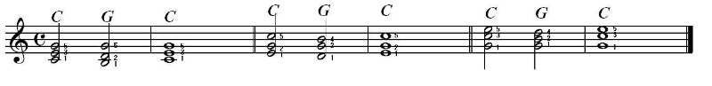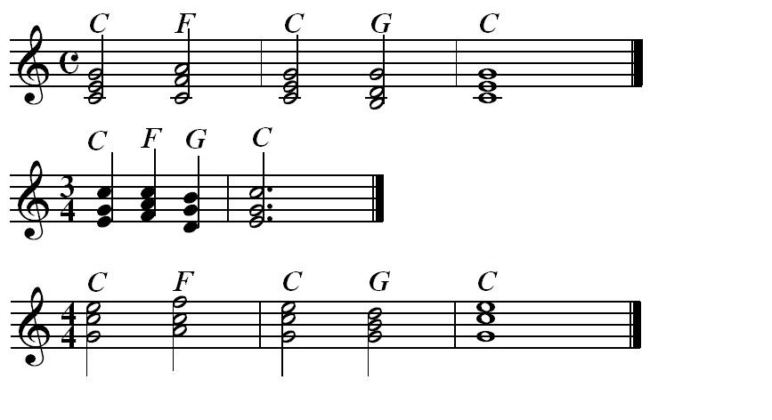 지난 시간에 배웠던 자리바꿈 화음들 별로 어렵지 않았지요? 오늘은 종지에 대해서 배워보겠습니다. 종지는 어떤 노래의 끝을, 혹은 한 단락의 끝을 어떤 화음으로 어떻게 끝낼 것인가 하는 하나의 계획입니다. 종지의 종류에는 크게 4가지가 있습니다. 그 중 정격 종지는 V 도에서 I도로 마무리 하는 종지 이지요. 일반적으로 노래의 가장 끝 부분에 쓰이면서 듣고 있으면 '아 이제 끝나는 구나'의 느낌을 갖게 해줍니다. 예전에 배웠던 으뜸음과 이끈음을 기억 하시나요? 이끈음은 C장조에서 제 7음인 B음을 말하는 것인데 이 음이 나오면 꼭 C로 가고 싶게끔 만들어 줍니다. 즉, C로 이끌어 주는 음인데 정격종지에서 바로 그 쓰임새를 알 수 있습니다. 이 정격 종지 외에도 변격종지 (혹은 아멘종지, IV-I), 반종지 (I-V), 위종지 (V-VI) 등이 있지만 각각 쓰임이 다르므로 이번 강의 에서는 노래의 마침에 많이 쓰이는 정격종지를 다뤄보겠습니다.