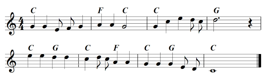 다음 악보를 보면서 코드가 써있는 박자에는 화음을 채워가며 쳐보세요. 주의할 점은 멜로디를 담당하는 음이 화음의 맨 위로 오게 하는 것 입니다. 그러나 매 박자마다 화음을 넣어줄 필요는 없고 코드가 써있는 그 박자에만 넣어주시면 됩니다.