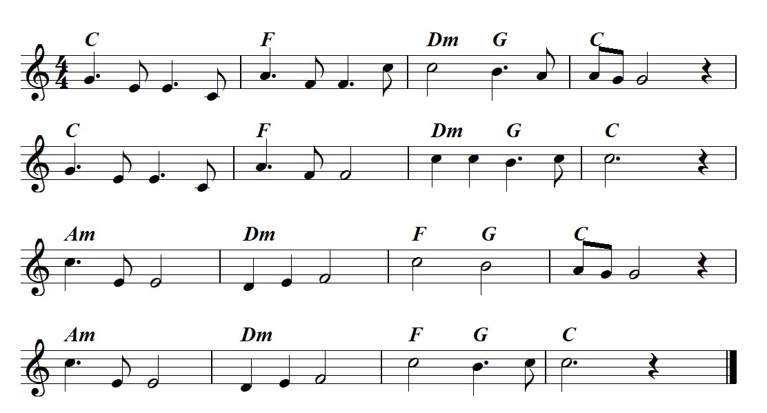 1. 먼저 첫째단은 모두 단순하게 기본형을 반복하여 각 마디의 4박자를 채워봅시다.