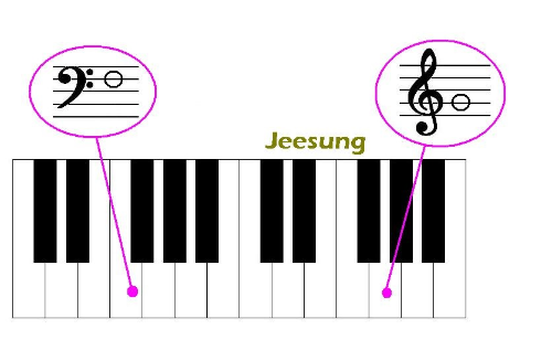 다시 피아노를 살펴 볼까요? G 도 많고 F도 많고 어느 위치에 있는 G인지 알려드릴께요. 피아노 앞에 앉으면 중앙 쯤에 보통 피아노 제조사 이름이 있습니다. 일본의 YAMAHA나 우리나나의 SAMICK이나 YOUNG CHANG이 많이 들어본 이름일 것입니다. 저는 여기에 Jeesung 이라고 쓰겠습니다. 그 곳을 중심으로 오른 쪽 부분의 처음 G 가 바로 높은음 자리표의 둘째 줄의 G가 됩니다. 그리고, 왼쪽으로 봤을때 처음 F 가 낮은음자리표의 네째줄의 F가 되는 것이지요. 그림을 볼까요?