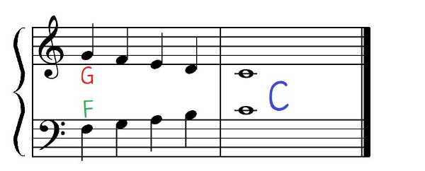 본인의 피아노에서 위 그림과 같이 G 와 F를 찾아서 쳐보세요. 그리고 두 건반의 정 중앙을 찾아보세요. 오른손은 5번 손가락으로 G음 부터 차례로 내려가고 왼손도 5번 손가락을 F음 에 두고 차례로 올라가다 보면 두 손이 만나게 되는 곳이 있지요? 첫 시간에 배웠던 C를 모두 누르셨으면 성공입니다. 이 C음은 특히 middle C라고 부릅니다. 우리나라 말로 '가온다' 이지요.