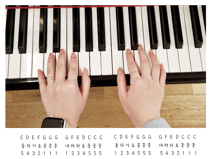 오른손 1번 부터 5번 까지 차례로 건반을 눌러보세요. (CDEFG)