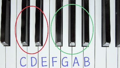 피아노 뚜껑을 열었으면 무엇이 보이는 지 말해봅시다. 먼저 검은 건반과 흰 건반들이 보이지요? 다시 검은 건반들을 자세히 봅시다. 이 검은 건반들은 흰 건반들과는 달리 몇개씩 짝지어 있는 것을 발견할 수 있을 겁니다. 흰 건반 사이에 위치해 있는 검은 건반들은 모든 흰 건반 사이에 있지 않고 중간 중간 비어있는 곳이 있지요? 다시 자세히 보시면 일정한 규칙으로 검은 건반이 위치해 있습니다. 바로 두개짜리와 세개짜리씩 그룹으로 묶여 있다는 걸 확인하셨을 겁니다. 이제 모든 두 개짜리 건반들을 찾아봅시다. 아래 사진과 같이 잘 찾으셨지요? 바로 빨간 동그라미로 묶여 있는 두 개짜리 검은 건반을 잘 보세요. 그 두개짜리 건반 아래에 있는 흰 건반들 음이름이 바로 C, D, E 입니다. 여기서 부터 차례로 C,D,E,F,G,A,B 입니다. 흔히 도, 레, 미 라고 하지요? 앞으로 우리가 보게될 악보에서는 반주 코드들이 모두 알파벳으로 쓰이니까 이젠 음이름을 알파벳으로 불러주겠습니다. 추가 설명을 덧붙이자면 사실 "도, 레, 미, 파, 솔, 라, 시, 도" 는 음이름이 아니라 계이름, 다시말해 별명과 같은 것이지요. 하지만, 이탈리아에서는 음이름으로 사용하고 있습니다. 나라마다 쓰이는 언어가 다르니 이 건반들을 부르는 이름들도 다 다르겠지요? 대부분의 나라에서는 C,D,E,F,G,A,B를 쓰고 있습니다. 우리나라에서의 음이름은 "다,라,마,바,사,가,나" 입니다. 대부분 다장조의 노래로 음악을 배우기 시작하다보니 편의상 '도,레,미,파,솔,라,시,도'를 쓰고 있는 것일 뿐이지요. 이부분에 대해서는 추후에 더 자세히 설명해 드리겠습니다.