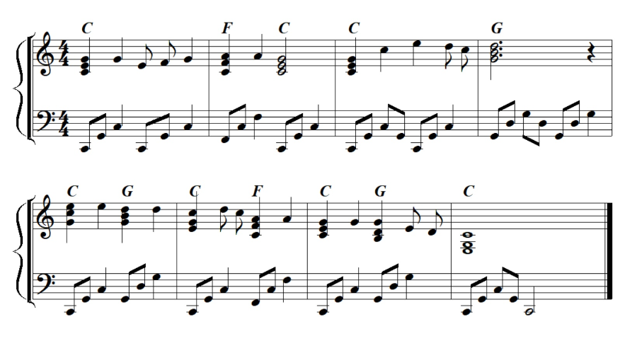 지금까지는 왼손은 코드를 보면서 그냥 옥타브로 쳐왔지요? 이젠 뭔가 힘을 주어야 할 때 입니다. 먼저 왼손을 C코드에 맞추어 옥타브로 잡아 볼까요? 편하게 옥타브 만큼 손가락을 벌렸을 때 두번째 손가락이 어느 음에 닿게 되는지 살펴봅시다. 사람들 마다 손의 사이즈는 다르겠지만 제가 만난 99프로의 사람들은 이렇게 손을 폈을때 두번째 손가락은 보통 5도위인 G음 위에 오게 됩니다. 이젠 아래 음 부터 C-G-C를 쳐볼까요? 옥타브를 같이 누르는 것이 아니라 아래에 새끼 손가락으로는 C음을 그리고 두번째 손가락으로는 G음을, 마지막으로 엄지 손가락으로는 옥타브 위인 C음을 치는 것이지요. 같은 방식으로 G 코드도 잡아보세요. G-D-G 가 되지요? 그럼 F코드도 쳐보세요. F-C-F 가 되나요? 어떤 음에서 시작 하던지 이렇게 5도위의 음을 두번째 손가락으로 잡는 것을 기본으로 합니다. 새끼손가락부터 차례로 훑고 올라온다는 느낌으로 쳐보세요. 이제는 리듬을 더해 보겠습니다. 4분음표, 4분음표, 2분음표로 만들어보겠습니다. 먼저 ‘하나, 하나, 하나두울’ 로 카운트 했던 것 기억 나지요? 이 박자에 맞추어 왼손으로 C-G-C를 쳐보세요. 대부분의 반주에서 왼손과 오른손의 멜로디를 같이 쳐야하기 때문에 왼손이 무게중심을 잘 잡아주는 것이 중요합니다. 왼손만 연습할때 쉽다고 그냥 빨리 쳐버리지 마시고 꼭 "하나,하나,하나두울" 이라고 말하면서 연습하시길 바랍니다.