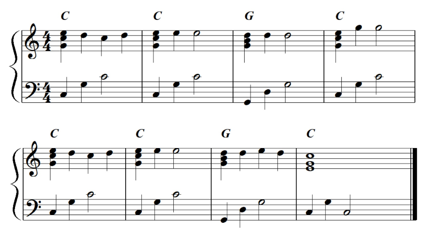 다음 악보를 보면서 코드가 써있는 박자에는 화음을 채워가며 쳐보세요. 주의할 점은 멜로디를 담당하는 음이 화음의 맨 위로 오게 하는 것 입니다. 그러나 매 박자마다 화음을 넣어줄 필요는 없고 코드가 써있는 그 박자에만 넣어주시면 됩니다.